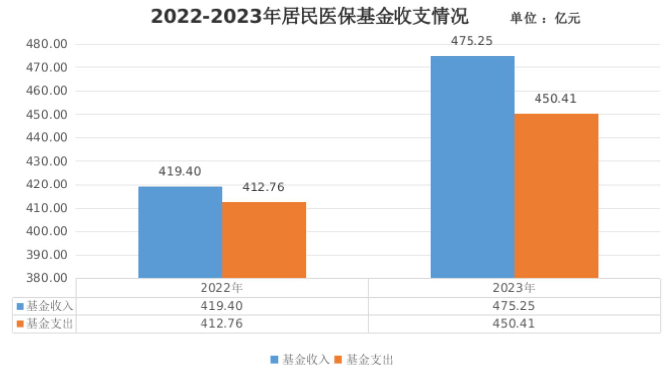 2.基金收支。2023年,居民医保基金收入475.25亿元,支出450.41亿元,当期结存24.84亿元,累计结存431.97亿元。
