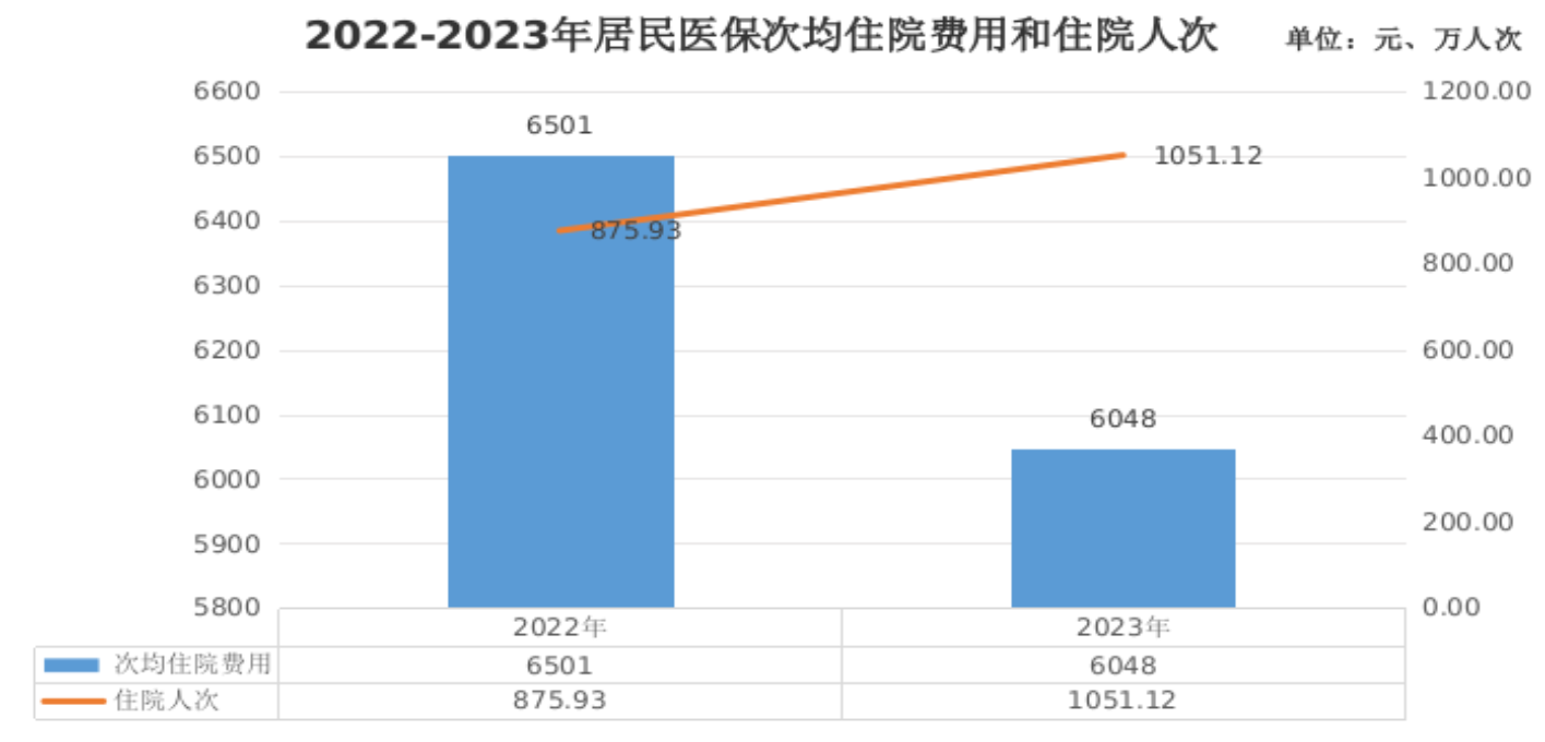 3.待遇享受。2023年,参加居民医保人员享受待遇8385.61万人次,比上年增长16.18%。其中,普通门急诊5967.77万人次,门诊慢特病1366.71万人次,住院1051.12万人次。次均住院费用6048元,其中,在三级、二级、一级及以下医疗机构(含未定级)的次均住院费用分别为11224元、5541元、2282元。居民医保参保人员住院率为23.78%,次均住院床日7.8天。