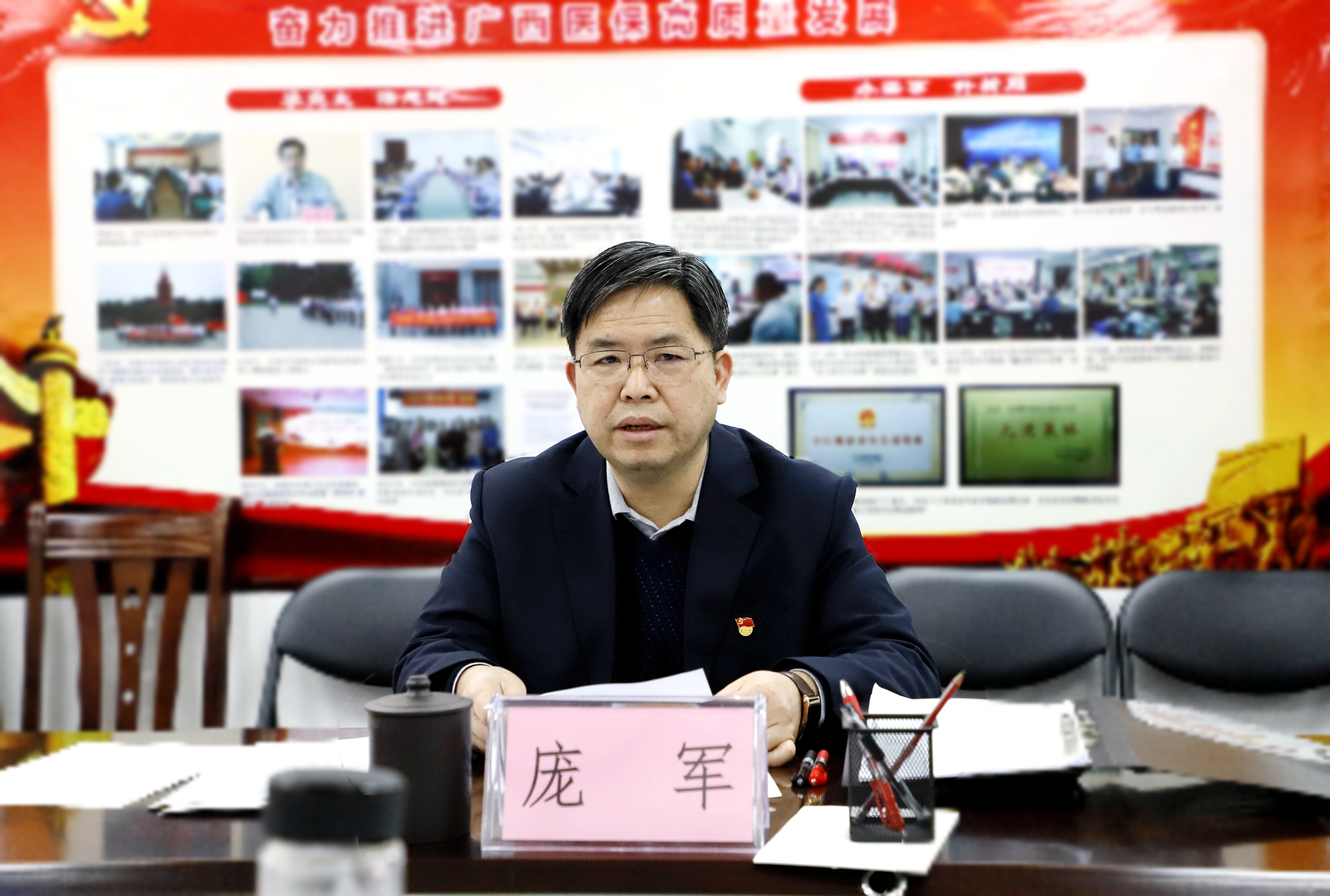 党组书记、局长庞军主持会议并讲话。自治区纪委监委驻自治区卫生健康委纪检监察组组长、自治区卫生健康委党组成员彭志杰到会指导。