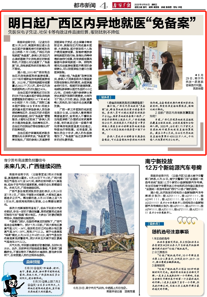 6月29日,南国早报记者从自治区医疗保障局举行的新闻发布会上获悉:7月1日起,广西区内异地就医“免备案”,参保人员在区内出差或跟随子女异地居住时就医购药,不用担心忘记备案了。“免备案”后,异地就医购药的报销比例不降低。