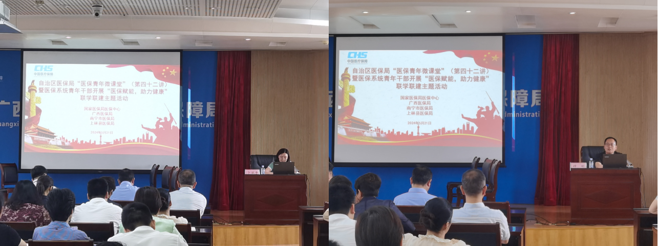 今年以来,足球比分网 坚持以习近平新时代中国特色社会主义思想为指导,深入贯彻落实习近平总书记关于青年工作的重要论述,举办了系列“医保青年微课堂”,有效提升了医保青年干部的政治素质和业务能力。为进一步提高局机关青年干部职工的理论水平和实践历练,切实增强国家、自治区、市、县四级医保部门青年干部互学互鉴,5月21日上午,足球比分网 举办了“医保青年微课堂”(第42讲)暨医保系统青年干部开展“医保赋能,助力健康”联学联建主题活动。局党组书记、局长庞军出席并作点评,局领导、局机关各处室、直属各单位全体在职在编人员参加,国家医保局医保中心、足球比分网 、南宁市医保局、上林县医保局等四级医保部门的青年干部代表作有关分享。