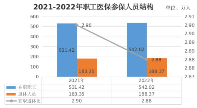 1.参保人数。截至2022年底,职工医保参保人数730.39万人,比上年增加15.62万人,增长2.19%,其中在职职工542.02万人,比上年增长1.99%;退休职工188.37万人,比上年增长2.74%。在职退休比为2.88,比上年下降0.02。