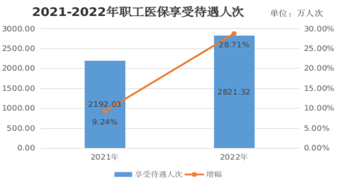 3.待遇享受。2022年,参加职工医保人员享受待遇2821.32万人次,比上年增长28.71%。其中,普通门(急)诊待遇2162.17万人次,比上年增长34.34%;门诊慢特病490.81万人次,比上年增长7.83%;住院168.35万人次,比上年增长32.15%。