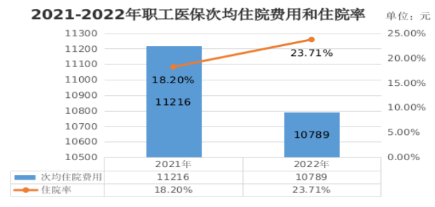 2022年,职工医保参保人员住院率23.71%,比上年提高5.51个百分点。其中:在职职工住院率14.37%,比上年提高4.74个百分点;退休人员住院率为50.95%,比上年提高9.11个百分点。全区职工医保次均住院费用为10789元,比上年下降3.81%。其中在三级、二级、一级及以下医疗机构的次均住院费用分别为13415元、6612元、3075元,分别比上年下降1.71%、11.96%、13.45%。次均住院床日8.6天,比上年减少0.9天。