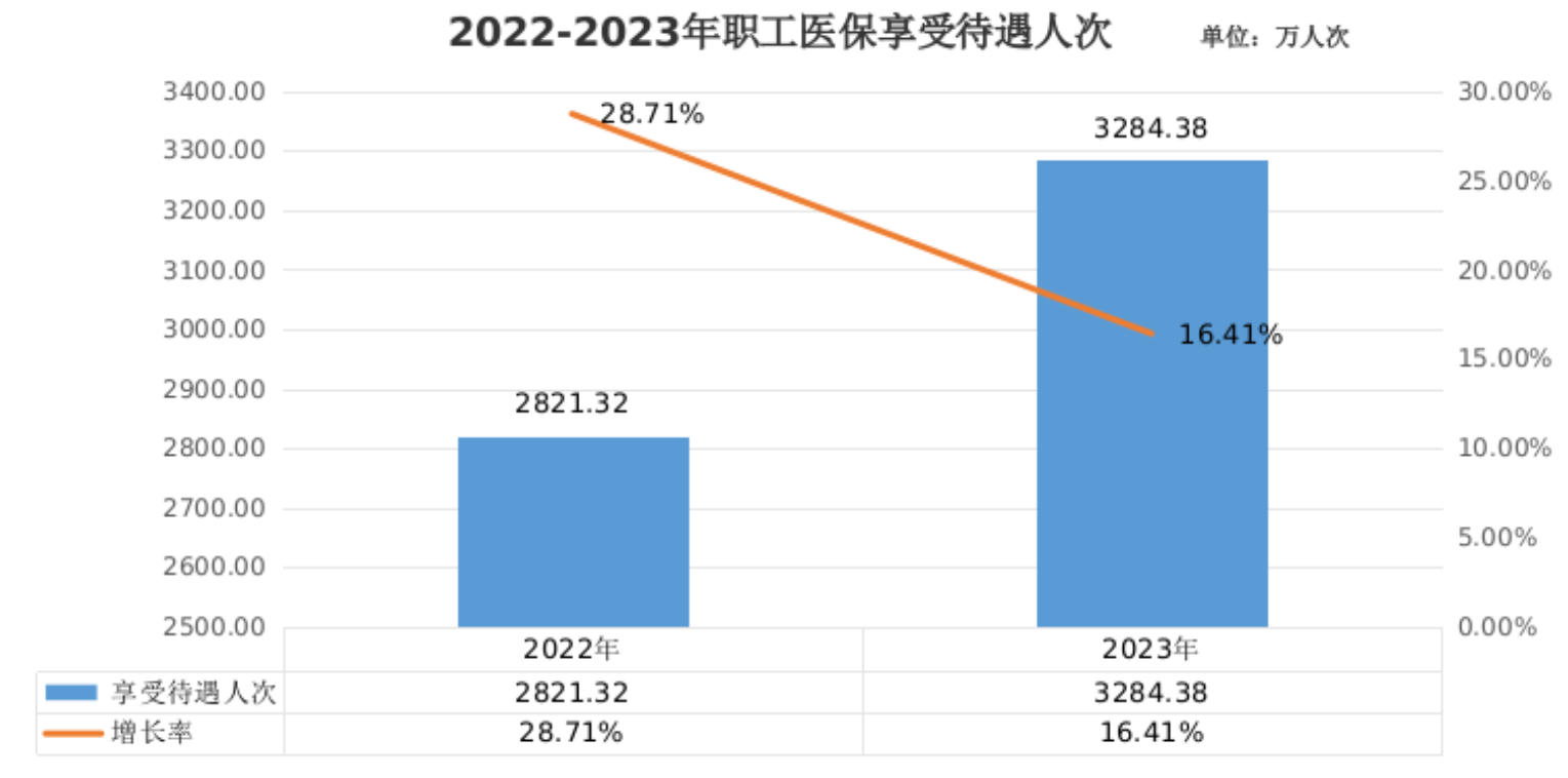 3.待遇享受。2023年,职工参保人员待遇享受人次较快增长,达3284.38万人次,比上年增长16.41%。其中,普通门急诊2555.30万人次,门诊慢特病531.78万人次,住院197.30万人次。此外,享受药店购药6824.09万人次。