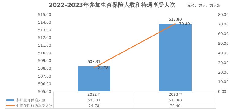 2023年,全区参加生育保险513.80万人,比上年增加5.49万人。从2023年起,进一步规范统一生育保险待遇享受统计口径,将产前检查、计划生育人次纳入生育保险待遇统计,享受各项生育保险待遇70.40万人次,比上年增加45.62万人次,比上年增长184.10%。生育保险基金支出17.24亿元。