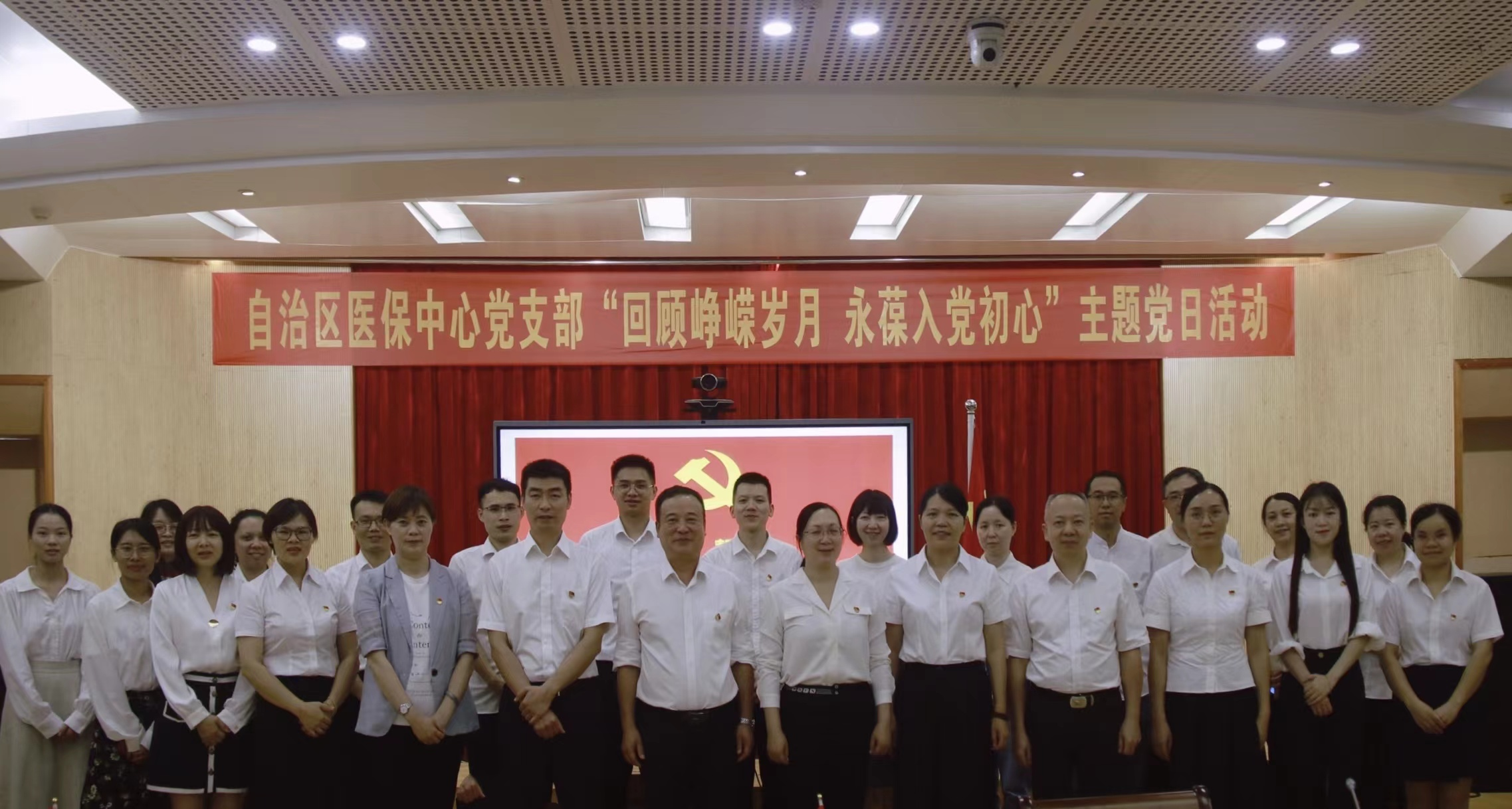 图为参加自治区医保中心党支部主题党日活动人员合影留念