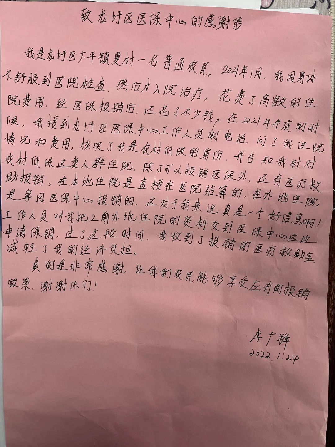 为充分发挥党组织战斗堡垒和党员先锋模范作用,龙圩区医保中心在2022年春节期间开展“为民办实事送温暖”服务活动,细致摸排出2021年曾在外地住院未报销医疗救助的低保人员和脱贫人口建档立卡人员,安排工作人员逐一电话通知相关人员把之前在外地住院的资料交到医保中心申请医疗救助报销,最终摸排出应享受医疗救助待遇共11人,合计补助医疗救助金额54299.5元。此举让相关的参保人员享受了应有的报销政策,减轻了他们的经济负担,也让龙圩区医保中心获得广大群众的一致好评,收到了群众送来的感谢信。