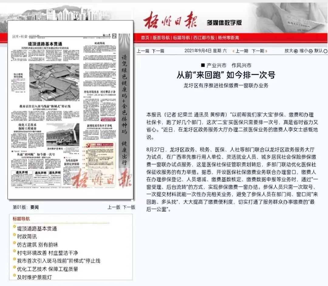 2021年9月4日 梧州日报刊登龙圩区一窗联办试点工作的创新服务做法