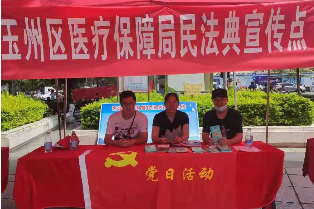 2021年赵琨(左一)组织同事积极开展《中华人民共和国民法典》宣传主题党日活动,同时向群众宣传医保相关政策,为群众答疑解惑。