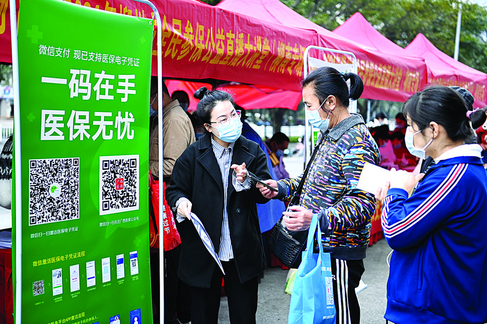 柳州市医疗保障局工作人员向市民宣传医保知识。 (黄蕊 摄)