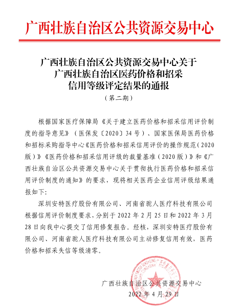 【信用评价】关于广西壮族自治区医药价格和招采信用等级评定结果的通报 (第二期)