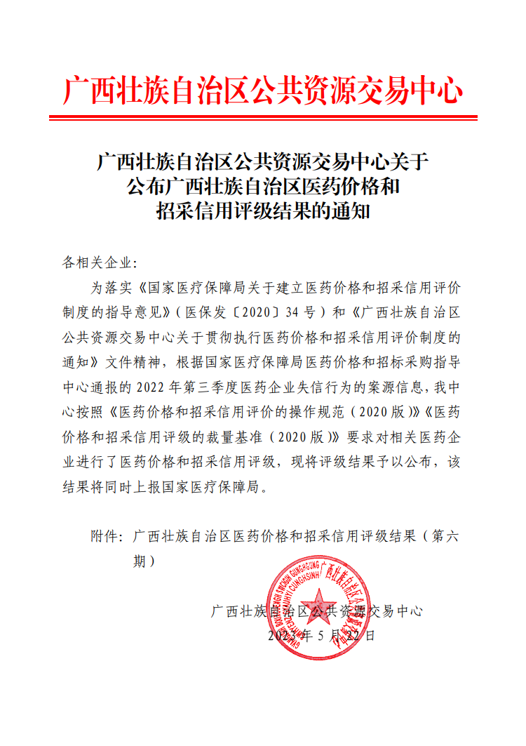 【信用评价】关于公布广西壮族自治区医药价格和招采信用评级结果的通知(第六期)