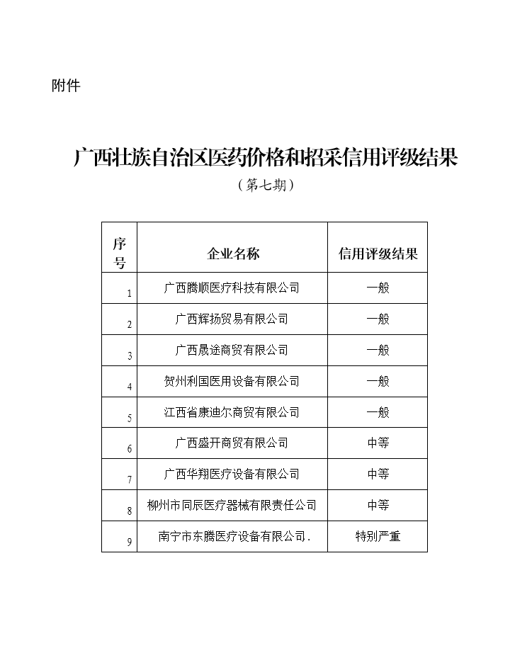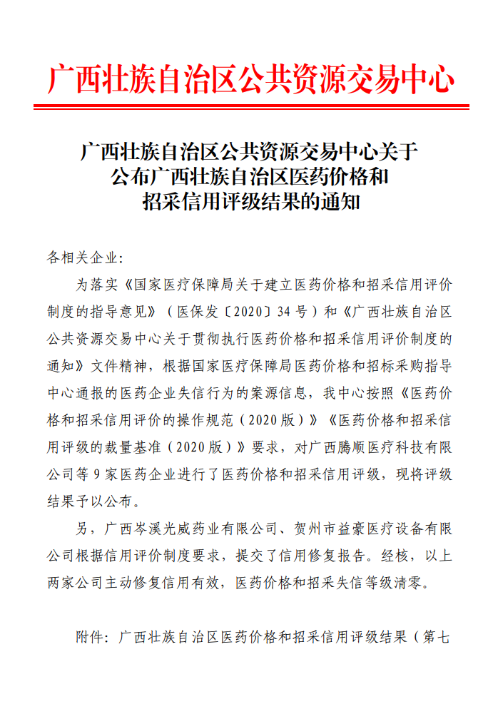 【信用评价】关于公布广西壮族自治区医药价格和招采信用评级结果的通知(第七期)