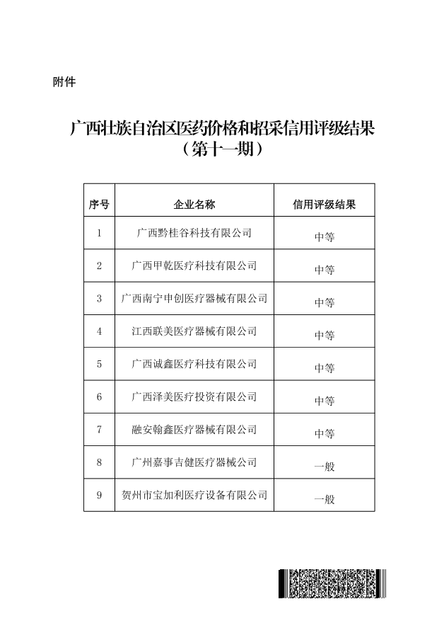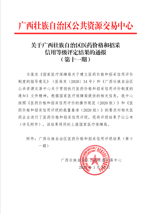 【信用评价】关于广西壮族自治区医药价格和招采信用等级评定结果的通报(第十一期)